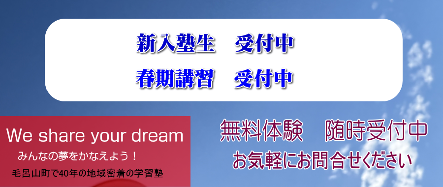 冬休み期間を利用して冬期講習を行います。中3生は受験に向けての最終調整を、中1・2年生は2学期までの復習をします。また中3生は1/1または1/3に「正月テスト」と言う5教科のテストを行います。申込は申込書、電話などでお願いします。